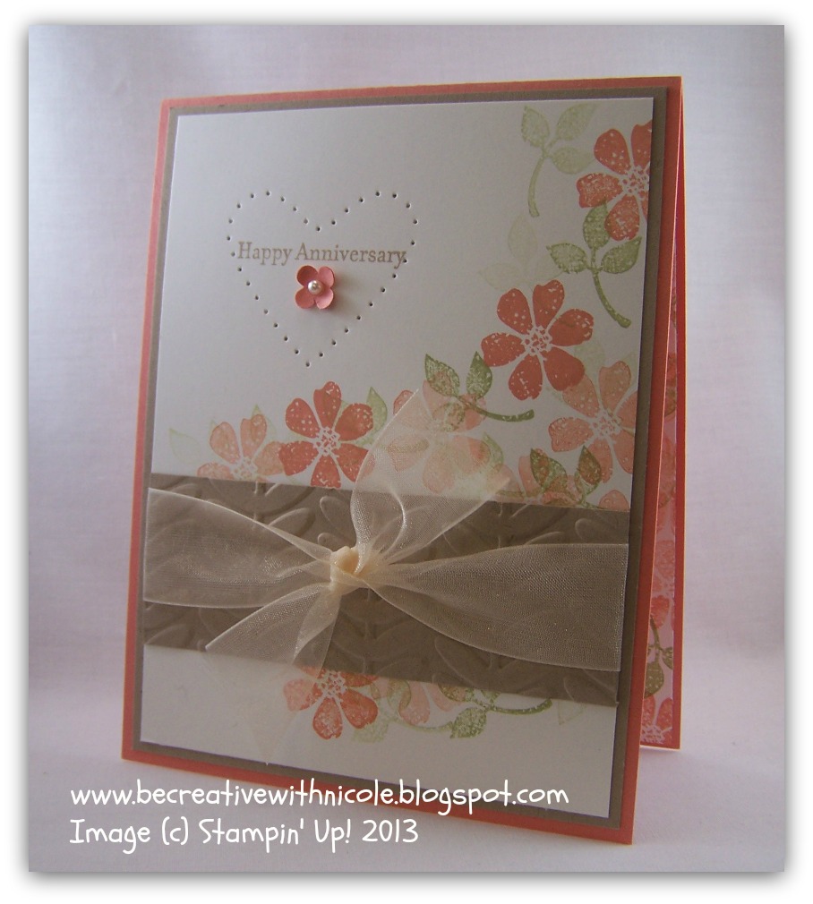 I wanted a card where I could have room to stamp the greeting and highlight it with paper piercing. This turned out perfect, I did Happy Anniversary with a heart around it and a small flower to add dimension. The Crumb Cake card stock embossed with Vine Street EF is wrapped with an old ribbon from years ago, Ivory 7/8" Organza. All in all the card is soft and pretty, just what I wanted!